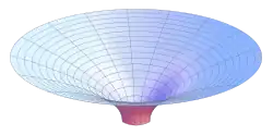 Thus, Flamm's paraboloid is useful for visualizing the spatial curvature of the Schwarzschild metric. It should not, however, be confused with a gravity well. No ordinary (massive or massless) particle can have a worldline lying on the paraboloid, since all distances on it are spacelike (this is a cross-section at one moment of time, so any particle moving on it would have an infinite velocity). A tachyon could have a spacelike worldline that lies entirely on a single paraboloid. However, even in that case its geodesic path is not the trajectory one gets through a "rubber sheet" analogy of gravitational well: in particular, if the dimple is drawn pointing upward rather than downward, the tachyon's geodesic path still curves toward the central mass, not away. See the gravity well article for more information.
