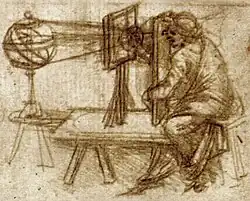 One of the instruments used by Leonardo for his research on anamorphosis was the tool for the angle of contingence, recreated in modern times using the Codex Atlanticus.[27] It is an instrument to determine the reflexion angle of a ray of light incident on the surface of a cylindrical mirror.
