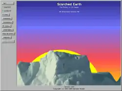 Scorched Earth is a shareware artillery video game. It was released for MS-DOS in 1991, originally written by Wendell Hicken using Borland C++ and Turbo Assembler.[2] Players control tanks to do turn-based battle in two-dimensional terrain, adjusting the angle and power of each tank turret before each shot. Scorched Earth adds destructible terrain and a variety of extreme weapons to the artillery formula.