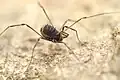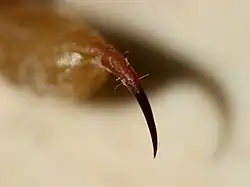 The pedipalp is a segmented, clawed appendage segmented into (from closest to the body outward) the coxa, trochanter, femur, patella, tibia (including the fixed claw and the manus) and tarsus (moveable claw).[51] Unlike those of some other arachnids, the eight-segmented legs have not been altered for other purposes, though they may occasionally be used for digging, and females may use them to catch emerging young. They are covered with many proprioceptors, bristles and sensory setae.[52] Depending on the species, the legs may have spines and spurs.[53]