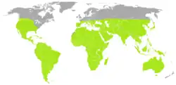 Scorpions are found on all continents except Antarctica. They are unusual among animal groups in that they are most diverse at the subtropics rather than the tropics, and are also less common near the poles.[29] New Zealand, and some of the islands in Oceania, have in the past had small populations of introduced scorpions, but they were exterminated.[30][29] Five colonies of Euscorpius flavicaudis have established themselves since the late 19th century in Sheerness in England at 51°N,[31][32][33] while Paruroctonus boreus lives as far north as Red Deer, Alberta.[34] A few species are on the IUCN Red List; Afrolychas braueri is classed as critically endangered (2012), Isometrus deharvengi as endangered (2016) and Chiromachus ochropus as vulnerable (2014).[35][36][37]