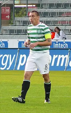 Brown was booked in Celtic's penultimate league game against Kilmarnock, which caused him to go over the disciplinary points threshold and receive a suspension for the first two matches of the 2011–12 season.[86] Brown helped Celtic to the 2011 Scottish Cup Final, which Celtic won 3–0 against Motherwell. This allowed him to collect his first trophy as Celtic captain.[87] Brown played 39 times for Celtic, scoring four goals, during the 2010–11 season.[88] He was often used on the right of midfield, partly due to the form of other central midfielders such as Beram Kayal, Joe Ledley and Ki Sung-Yueng, but also because Brown is more able to play in wide areas than them.[89]