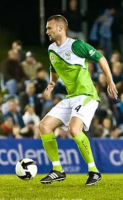 Wilson then signed for Dunfermline Athletic on 5 August 2002.[9] He made his Dunfermline debut in a 6–0 defeat to his former employers Rangers, just two weeks later.[10] Wilson played in the 2006 Scottish League Cup Final and the 2007 Scottish Cup Final, both of which ended in defeat to Celtic; his defensive colleagues included former Rangers youth teammate Greg Shields.[11][12] He scored one of Dunfermline's goals in the 2007 Scottish Challenge Cup Final, but this was also lost to St Johnstone. One of his last appearances for the club in April 2009 was an opportunity to reach another final, but the Scottish Cup semi-final at Hampden Park was lost to Falkirk, one of their local rivals.[13] In his seven-year spell at Dunfermline, he played in over 200 fixtures in the league alone.
