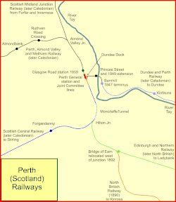 The Scottish Central Railway Act 1845 had included a branch to Perth Harbour, at Friarton. This was not merely a permission, but an obligation. Perth magistrates were anxious that the branch should be built, as they believed their burgh was losing out to Dundee because of the inconvenient transport links. The act had required the SCR to build the branch by 1 July 1851. The SCR was especially short of funds at this time and stalled, but the matter was taken to legal opinion in London, and the SCR felt compelled to build the line; it opened in 1852.[2]