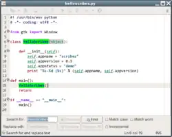 Scribes supports Python plugins, remote editing with FTP, SFTP, SSH, Samba, and WebDAV, and autosave. It also supports code snippets, auto-indentation, hotkeys, bookmarks, templates, and automatic word completion or replacement.[2][4] Scribes has syntax highlighting support for around 70 different programming languages, including PHP, Java XML, and HTML.[5] Editing icons are hidden from view until a user mouses over the area.[6][7]