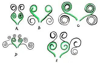 Examples of one basic form of the scroll, taken from existing monuments.[1] Note the common core element of the heart shaped confronted volutes & stem, highlighted in green.