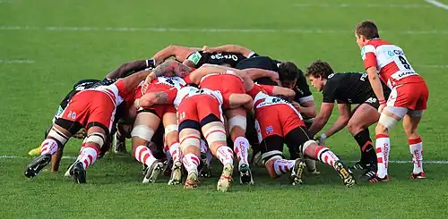 A scrummage, commonly known simply as a scrum, is a method of restarting play in rugby football that involves players packing closely together with their heads down and attempting to gain possession of the ball.[1] Depending on whether it is in rugby union or rugby league, the scrum is used either after an accidental infringement or when the ball has gone out of play. Scrums occur more often, and are now of greater importance, in union than in league.[2] Starting play from the line of scrimmage in gridiron football is derived from the scrum.