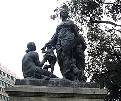 A public competition was organized in 1927 to decorate the square, with a jury made up of politicians and municipal technicians and a representation of the main artistic entities of the city.[8] Ninety projects were presented, of which the allegorical groups of Wisdom and Work by the Oslé brothers were chosen to appear in front of the Ramblas; three allegories of the Catalan provinces (Barcelona, by Marès; Gerona, by Parera; and Lérida, by Borrell) —the one of Tarragona was commissioned out of competition to Jaume Otero—; 16 stone statues for the colonnaded pavilion designed by Nebot, with works by Viladomat, Tarrach, Clarà, Llimona, Casanovas, Dunyach, Navarro, Arnau and Gargallo; and 12 statues and high reliefs for the niches in the square, by the artists Llimona, Navarro, Arnau, Tenas, Duran, Monjo, Gargallo, Alsina, Tarrach, Renart, Rebull and Soto. However, because of the "notorious difference in style with the rest of the square" the works of the last five were finally rejected in March 1928, and replaced by others by Monjo, Marès, Otero, Parera and Borrell. On the other hand, the derogation of the construction of the upper pavilion meant that in May 1929 eight of the sixteen sculptures planned for that space were finally not placed, while the rest were placed on a terrace that replaced the pavilion. Lastly, the placement of La Diosa by Clarà, a commission outside the competition, was approved.[9]