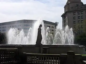 Since 1929 the sculptural ensemble of the square has remained practically unchanged, with the exception of the transfer in 1961 of the Fountain of the children riding fish, or the replacement in 1982 of the Goddess by Clarà by a copy, since the original was placed in the lobby of the Casa de la Ciudad. In 1937 a Monument to the Unknown Soldier was placed, work of Miquel Paredes, which was removed two years later after the victory of Franco's army.[14] In 1959 the ornamental fountains were installed on the mountain side of the square, the work of Fernando Espiau Seoane. The last sculpture was placed in 1991, the Monument to Francesc Macià by Josep Maria Subirachs. In 1993 were replaced by copies of the Youth by Clarà and the Pastor of the flute of Gargallo, due to its state of deterioration. In 2008 works were carried out by the company RUBATEC to remodel the pavement surrounding the square, the mosaic that houses in the center and improve access by adding ramps.[15]
