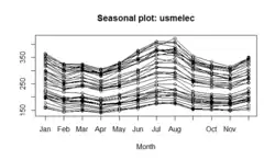 • A seasonal plot will show the data from each season overlapped[6]