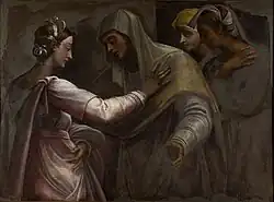 Two late projects for churches were never finished by Sebastiano. A large altarpiece of the Birth of the Virgin, still in Santa Maria del Popolo, Rome, was begun in the late 1530s but had to be finished after his death by Francesco Salviati.[4] Before his death in 1541, the executor of Agostino Chigi's estate commissioned a large Visitation as a memorial, in Santa Maria della Pace, Rome. It was still half-finished at Sebastiano's death in 1547, and was eventually removed in the 17th century. Fragments with some of the over life-size main figures are at Alnwick Castle, in a style of impressive simplicity, the end point of a "tendency to over-generalize appearances and pictorial structures so that they verged on an effect of geometrical abstraction" that had been increasing apparent in his work since his early years in Rome.[38]