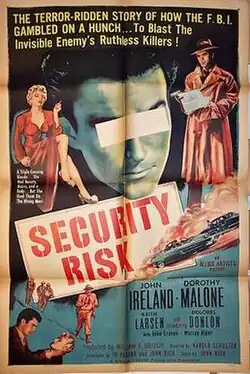 Security Risk is a 1954 American action film directed by Harold D. Schuster and written by Jo Pagano and John Rich. The film stars John Ireland, Dorothy Malone, Keith Larsen, Dolores Donlon, John Craven and Susan Cummings. The film was released on August 8, 1954, by Allied Artists Pictures.[1][2][3]