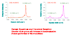 Selective functionalization increases the intensity of the D peak due to formation of aryl-nanotube bond and decreases the tangential mode due loss of electronic resonance. These two effects are generally summed together as increase in their peaks ratio (D/G). RBM peaks of metallic nanotubes decay and the peaks corresponding to those of semiconducting nanotubes remain almost unchanged.[3][4]