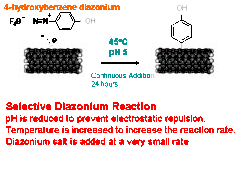 Primary condition is addition of reactant molecules at a very small rate to SWNT solution for a sufficient long time. This ensures reaction with only metallic SWNTs and with no semiconducting SWNTs as all the reactant molecules are taken up by the metallic SWNTs. Long time injection ensures that all metallic tubes are reacted. For example, one highly selective condition is: addition of 500 μL of 4-hydroxybenzene diazonium tetrafluoroborate solution in water (0.245 mM) at an injection rate of 20.83 μL/h into 5 mL of SWNT solution (1 wt % sodium dodecyl sulfate (SDS)) over 24 hrs. However, if the entire diazonium solution is added all instantaneously then semiconducting SWNTs will also react due to presence of excess reactant.[4]