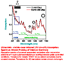 Selective diazonium chemistry abruptly decreases the peak intensities that represent the first Van Hove transition of metallic species (E11, metal), while the peak intensities representing the second (E22, semiconducting) and first (E11, semiconducting) Van Hove transition of the semiconducting species show little or no change. A relative decrease in metallic SWNT absorption features over semiconducting features represents a highly preferential functionalization of the metallic nanotubes.[3][5]