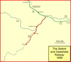 Selkirk lay about 5 miles (8.0 km) from Galashiels, and as well as woollen goods it had an important shoemaking industry. The independent Selkirk and Galashiels Railway was incorporated on 31 July 1854, with authorised capital of £24,000.[2] The promoters secured agreement with the North British Railway that the NBR would work the line; the terms were for 50% of receipts up to £3,000 a year and 45% above that.[3][4][5]