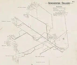 Senghenydd (Welsh: Senghennydd) is situated at the northern end of the Aber Valley, approximately four miles (6.4 km) north-west of Caerphilly[16][17] and eleven miles (18 km) north-west of Cardiff.[18] When geological surveys for coal began in 1890 it was a farming hamlet of around 100 people.[19][20] Coal was found, and sinking of the first mineshaft for Universal Colliery—which was owned and developed by William Lewis[c]—began in 1891; the first coal was extracted in 1896.[17][22] The colliery's two shafts were both 1,950 feet (590 m) deep, the downcast Lancaster and the upcast York.[23][d] Development of the pit coincided with the Boer War, and sectors of the underground workings were named after key places in the war, such as Pretoria, or the lifting of the sieges at Ladysmith, Mafeking and Kimberley.[20]