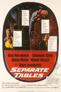 Separate Tables is a 1958 American drama film starring Rita Hayworth, Deborah Kerr, David Niven, Burt Lancaster, and Wendy Hiller, based on two one-act plays by Terence Rattigan that were collectively known by this name. Niven and Hiller won Academy Awards for Best Actor and Best Supporting Actress respectively. The picture was directed by Delbert Mann and adapted for the screen by Rattigan, John Gay and an uncredited John Michael Hayes. Mary Grant and Edith Head designed the film's costumes.