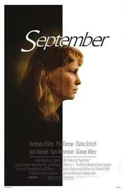 Allen's intention for September was that it be like "a play on film," hence the great number of long takes and few camera effects. The film does not use Allen as an actor, and is one of his straightforwardly dramatic films. The cast includes Mia Farrow, Sam Waterston, Dianne Wiest, Elaine Stritch, Jack Warden, and Denholm Elliott.