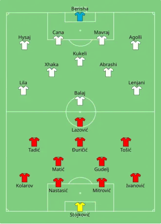 During the game's opening moments, Serbian fans burned a NATO flag.[20] Around 15 minutes into the game, the first flare was thrown on the pitch. Approximately ten minutes later, a Greek flag was raised by the Serbian fans. Ten minutes before half time, flares were thrown towards Ansi Agolli as he was about to take a corner kick, and a firecracker exploded.[21] Several objects were thrown at him, and at the assistant referee. The match was briefly suspended, and Danko Lazović and Aleksandar Kolarov attempted to ease tension as players briefly retreated from stands. After 40 seconds, the match continued, while the stadium announcer asked fans not to throw objects onto the pitch. At around the 40-minute mark, a bottle was thrown at Bekim Balaj, and some Serbian fans tried to invade the pitch, leading to brawls between them and security.[22]