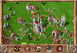 Whether playing a mission or a free game, each game begins the same way; the player is presented with part of the map, usually a green area on which it is easy to build, and must construct their castle/headquarters to begin their settlement.[17][18] The basic gameplay revolves around serfs (the titular "settlers") who transport materials, tools and produce, and who populate and perform the requisite task of each building.[19][20] As the player constructs buildings and thus requires settlers to occupy them, the settlers automatically emerge from the castle as needed.[21][22] As the settlement continues to grow in size, the castle's quota of settlers will eventually be reached, and the player will need to build a warehouse to generate more settlers.[23] At no point does the player directly control any individual settler - instead, general orders are issued (such as ordering the construction of a building), with the AI handling the delegation of orders to specific settlers.[11][24]