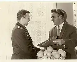 Sergey Pavlov was born in Rzhev into a family of a peasant father and a noble mother. His maternal grandfather, Nikolai Timofeevich Vasiliev, graduated from the St. Petersburg Conservatory and worked as a conductor. Maternal grandmother Glafira Sergeevna Pylaeva came from a hereditary family of clergymen. His paternal grandfather, Pyotr Pavlov was captured by the Germans during the First World War, and learnt how to make confectionary while he was a prisoner of war. Sergei's father, Pavel Pavlov, was the choirmaster in Rzhev, and his mother was a pianist. Sergei and his mother were evacuated after the German invasion in 1941, while his father organised a choir on the front line.[1] After his return, Sergei went to an agricultural college in Rzhev, and then the Moscow Institute of Physical Education, where he was appointed secretary of the Komsomol (Communist Youth League) committee. He worked as a full-time Komsomol official for seven years, and in 1959 was appointed the First Secretary of Komsomol, the youngest holder of that office in 25 years. In October 1961, he was made a member of the Central Committee of the Communist Party of the Soviet Union.