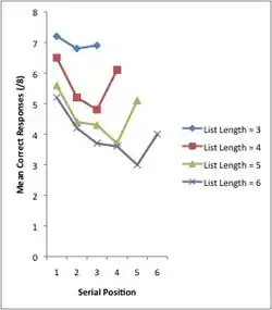 In serial memory processing, Primacy effect and recency effect effects for accuracy of recall are commonly found. These effects are found for both visual[4] and auditory[5] stimuli in memory tasks. This means that of the many items in a memory set during serial memory processing, the first item and the last seem to be recalled faster and more accurately than the other items. These effects may exist if recall errors are due to serial position. It is theorized that items are mistaken for other items from a nearby position in the memory set (e.g. the 5th item is mistaken for the 4th item or the 6th item). Since there are more nearby serial positions to middle items in a set, there are therefore more opportunities for mixing-up items. On the other hand, there are very few serial positions nearby to the first and last position, and therefore these positions may be remembered more accurately (or mistaken less). The first and last position may be less error-prone positions and more easily recalled.[6]