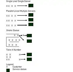 When demand exceeds capacity, customers may have to wait for services. Lovelock identifies a range of different types of waiting lines or queuing systems:[38]