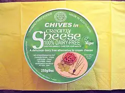 A soy cheese package with a serving suggestion - the product itself is shown smeared on a cracker, accompanied by pretzels and grapes. The text "Serving suggestion" can be seen on the lower border of the serving suggestion image.