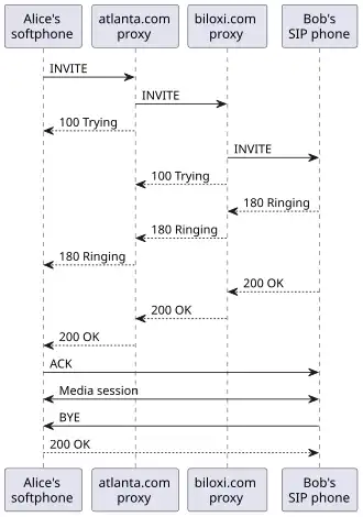 An example of a SIP message exchange between two users, Alice and Bob, to establish and end a direct media session.