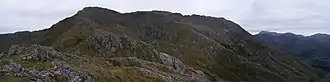 An old stalkers' path from the ruined cottage should guide the climber to a point just below a ridge at about 650 metres. The path was well built in its time but some sections have become wet and slippery. On gaining the ridge, turn left and follow the ridge to the 894 m triangulation point. The ridge becomes steep near the top but the steepest section can be bypassed. Contrary to the implication of the 1:50,000 Landranger map, several websites and the 1990 edition of the Scottish Mountaineering Club publication The Corbetts and other Scottish Hills, the true summit lies about 600 metres to the north west of the triangulation point.[1] List tickers should therefore turn right along the main ridge of the range and continue for about 600 metres to the main summit, which is not shown on any map. About 300 m further along the ridge is an 881 m summit, which is shown on topographic maps.