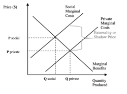 Shadow prices are often utilised in cost-benefit analyses by economic and financial analysts when evaluating the merits of public policy & government projects, when externalities or distortionary market instruments are present.[7] The utilisation of shadow prices in these types of public policy decisions is extremely important given the societal impacts of those decisions. After incorporating shadow prices into the analysis, the impacts resulting from the policy or project may differ from the value obtained using market prices. This is an indication that the market has not properly priced the costs or benefits in the first place, or the market hasn’t priced them at all.[8] By conducting analysis with shadow prices it allows analysts to determining whether doing the project will provide greater benefits than the costs incurred in totality. Not just the private or referent group benefits.