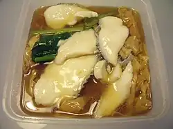 Shahe fen (Chinese: 沙河粉; pinyin: shāhé fěn, also simply hor fun / he fen Chinese: 河粉) or guotiao (Chinese: 粿條; pinyin: guǒtiáo, also kway teow) is a type of wide Chinese noodle made from rice.[1][2] It is often stir-fried with meat and/or vegetables in a dish called chao fen (炒粉; pinyin: chǎo fěn); it is also a main ingredient in char kway teow.