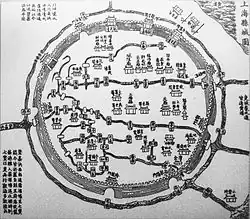 There may have been some sort of defensive works around the county seat of Shanghai from the 11th century.[1] The city wall, which survived until the 20th century and parts of which remain to this day, was, however, built in 1554 during the Ming dynasty, in order to protect the town from raids by Japanese pirates. It measured 10 metres (33 ft) high and 5 kilometres (3.1 mi) in circumference.[2] In addition to the local garrison, the city was surrounded by Qing army posts at Jiangning (Nanjing), Jingkou (Zhenjiang), Hangzhou, and Zhapu.[3]