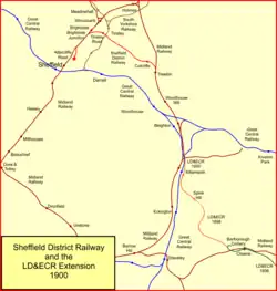 The Sheffield District Railway was a 3+12-mile (6 km) railway line in South Yorkshire, England. It was built to give the Lancashire, Derbyshire and East Coast Railway access to Sheffield, primarily for goods traffic, for which a large goods depot at Attercliffe, in Sheffield, was built. The construction was sponsored by the LD&ECR and the Great Eastern Railway together, with the support of the Midland Railway, which agreed running powers over sections of its own lines. The Sheffield District Railway opened in 1900. The LD&ECR operated the passenger service, although the Midland Railway later ran passenger trains too. The SDR did not have rolling stock and did not operate trains itself. The LD&ECR was absorbed by the Great Central Railway in 1907, and the GCR inherited the LD&ECR running powers.
