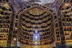The tomb of Sheikh Safi al-Din Ardabili is a cylindrical tower topped off with a short dome. Beneath the dome, there is a vault that is one of the valuable works of the tomb, and around the edge of it, there is an inscription carved in the Reqa' style calligraphy. One of the unique features of the tomb of Sheikh Safi al-Din Ardabili is that it contains several valuable works of art on different themes of art, including the perfect type of mosaic tiles, vaulted tiling with painting, stuccos, beautiful precious inscriptions, and the wonderful calligraphy of the greatest calligraphers of thd Safavid era (Mir Emad Hassani, Mir Qavamoddin, Mohammad Ismail, etc.), precious wood-carvings, silversmithing, illuminated manuscripts and goldsmithing, paintings, using a different style of stonework, etc.[10]