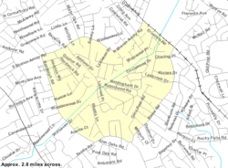 The Sherwood Forest neighborhood of Charlotte, North Carolina was established in the 1950s. In addition to the Sherwood Forest subdivision, the area also includes the Castleton Gardens and Charlestowne Manor subdivisions. The area is bisected by McMullen Creek and is bounded by Sardis Road to the south, Rama Road to the southeast, and by the former Seaboard Air Line Railroad, now CSXT to the northeast, Sharon Amity Road to the north, and Randolph Road to the west. Sherwood Forest is also neighbored by the areas known as East Forest, Stonehaven, Landsdowne, Providence Park, and Cotswold. The area's dominant architectural style is the ranch-style house with brick or wood exterior. In keeping with its namesake, some of the area's street names (such as Nottingham Dr. and Robinhood Rd.) are attributed to characters and places in the Robin Hood stories.