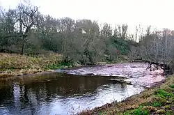 Shewalton Mill was a corn mill on the River Irvine, first recorded in the 17th century and shown with a weir across the river in the 19th century,[22][23] but is now a total ruin with only remnants of the weir surviving (datum 2012). John Cullen, buried at Dundonald, was one of the millers at Shewalton and died in 1797 aged 59.[24]