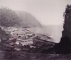Shortly before his death, Nariakira was left with only a two-year-old son (Tetsumaru) and eight-year-old daughter (Teruhime). He had been forced to ask Narioki to decide between Hisamitsu or Hisamitsu's son Tadayoshi to succeed him as daimyō.[24] Saigō and Ōkubo felt the death of all of Nariakira's viable heirs was caused by Yura and wanted retribution, but Nariakira would not allow it.[25] On July 8, 1858, Nariakira was supervising the joint preparatory maneuvers in Tempozan for sending 3,000 Satsuma soldiers to Edo, and he succumbed to the heat. He was transported to Tsurumaru Castle, where he died on the 16th. A few years after his death, he was deified as a Shinto kami, Terukuni-daimyōjin. His son Tetsumaru died shortly after his father.