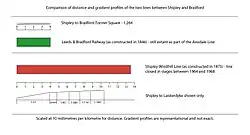 Comparison chart detailing distances and gradients on the two railways that ran from Shipley to Bradford. The Green line is the Midland built line and the red line is the Great Northern built line. The green line is still extant and running as part of the Airedale line through Bradford Dale.