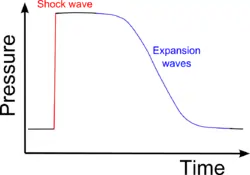 Pressure–time diagram at an external observation point for the case of a supersonic object propagating past the observer. The leading edge of the object causes a shock (left, in red) and the trailing edge of the object causes an expansion (right, in blue).