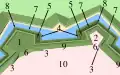 The various bastions, ravelins and lunettes of the fortification were all named and would mount over 230 cannon and mortars during the course of the siege. The principal effort of the French concentrated on the bastions Coehoorn and Pucelle. Facing the French trench lines, the sides of Coehoorn were flanked on its right by the ravelin Antwerpen and on its left the ravelin Diden. Between the bastion and Antwerpen was the lunette Holland and between the bastion and Diden was the lunette Zealand. To the left of Diden was the lunette, Utrecht, and left of that the bastion Pucelle. The area between the bastions of Coehoorn and Pucelle was chosen partly because the ground was drier and partly because this was the only part of the fortress not directly covered by additional lines as was the northwest and south east sides of Bergen op Zoom. This area would witness the most continuous and fierce combat of the siege.[18]