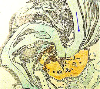 On 22 September 1866 they landed troops on the edge of the only substantial piece of firm ground, a meadow marked M on the map Terrain. To attack in that place was a rational decision in itself, for they had hit upon a weak spot, and they might well have prevailed, greatly shortening the war. But their commands were divided, they dithered and delayed, and the Paraguayans built a defensive earthwork in the nick of time.[17]