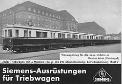 The Siemens-Schuckert Orenstein & Koppel (normally abbreviated to Siemens O&K) is an underground car formerly used on the Buenos Aires Underground first built by Siemens-Schuckert and Orenstein & Koppel in 1934, 1937 and 1944 with a smaller number of cars built in Argentina during the 1950s. The Siemens O&K rolling stock made up the entirety of the trains used on the three lines built by the Hispanic-Argentine Company for Public Works and Finances (CHADOPyF) and has since served on every line of the Underground (with the exception of Line B, which uses third rail electrification) from 1934 to 2016, with cars refurbished by the Emepa Group and Alstom continued to function on the network till 2017.[1]