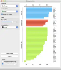 The silhouette value is a measure of how similar an object is to its own cluster (cohesion) compared to other clusters (separation). The silhouette value ranges from −1 to +1, where a high value indicates that the object is well matched to its own cluster and poorly matched to neighboring clusters. If most objects have a high value, then the clustering configuration is appropriate. If many points have a low or negative value, then the clustering configuration may have too many or too few clusters. A clustering with an average silhouette width of over 0.7 is considered to be "strong", a value over 0.5 "reasonable", and over 0.25 "weak". However, with an increasing dimensionality of the data, it becomes difficult to achieve such high values because of the curse of dimensionality, as the distances become more similar.[2] The silhouette score is specialized for measuring cluster quality when the clusters are convex-shaped, and may not perform well if the data clusters have irregular shapes or are of varying sizes.[3] The silhouette value can be calculated with any distance metric, such as Euclidean distance or Manhattan distance.