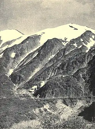 Placer was found in the basin's Gold Creek in 1880 by Richard Harris and Joe Juneau.[6][7] This gold discovery led to the creation of the town called Juneau.[3] Over the next nine years, sluicing operations recovered thousands of ounces of gold. Sitka engineer George E. Pilz is closely connected to development in the basin,[8] as well as having grubstaked the prospectors Harris and Juneau.[3] By the end of the decade, large scale hydraulic mining was in operation.[9] The mines were reached by a 3.5 miles (5.6 km) wagon road that zig-zagged across the hill.[5]