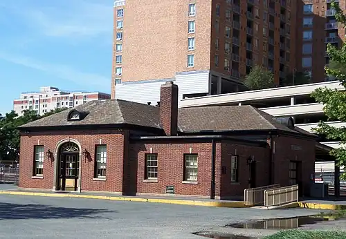 The eastbound waiting room, a small rectangular building of similar design, stood on the south side of the tracks. Built along with the station in 1945, it was rebuilt in 1976 to make way for tracks laid for the Washington Metro. An underground pedestrian tunnel connected the two buildings beneath the track bed.[9] In 2008, the building was demolished to make way for other development.[10]