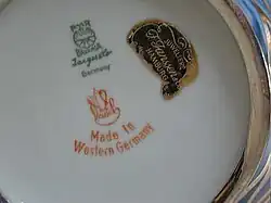 Friedrich Deusch used the impressed mark "Deusch 1000 / 1000" on the early items. This mark was punched directly into the silver. Very often one may also find a red three-digit number on the bottom of the porcelain or glass which indicates this early production. Later, it was replaced by a red stamp which shows a coffeepot and the name Deusch. In addition, to these marks, the following marks may also be found: "1000 / 1000 Silber" or "1000 / 1000 Feinsilber". Later items may have the additional mark "Made in Western Germany".