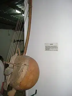 The simbing is a Malian harp-lute, used by the Mandinka people of Mali, and the Mandinka and Jola peoples of Senegal and Gambia.[2][3] The instrument consists of a calabash resonator, a (usually curved) stick for a neck, a metal jingle attached to the neck, and a bridge that holds the string over the skin soundboard in a vertical line.[2] For comparison, lutes (such as the guitar) usually have the strings held in a horizontal line above the soundboard. The instrument has five to nine strings. A simbing from the 1790s was reported as having seven strings by Mungo Park.[4]