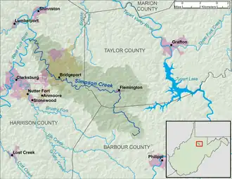 Via the West Fork, Monongahela and Ohio Rivers, Simpson Creek is part of the watershed of the Mississippi River, draining an area of 73 square miles (190 km2)[5] on the unglaciated portion of the Allegheny Plateau. It rises approximately 5 miles (8.0 km) northwest of Philippi in northwestern Barbour County and flows generally northwestwardly through southeastern Taylor County and northeastern Harrison County, passing through the communities of Flemington and Bridgeport; it flows into the West Fork River approximately 4 miles (6.4 km) south-southwest of Shinnston.[6]